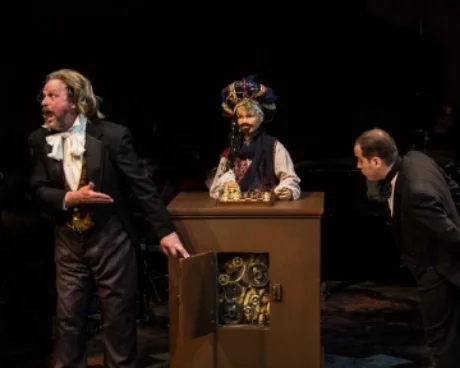 The BCT adaptation, directed by Burgess Clark, the theater’s executive artistic director, unspools the yarn with detours into a glum Gothic mountain town and the camp of a failing traveling circus. How Pezzo (played with relish and an accent borrowed from Father Guido Sarducci by local stage veteran Steve Gagliastro) manages to introduce his larcenous monkeys to the joyless townspeople and the hapless circus performers is a trick nearly as precarious as Pezzo balancing all those brightly colored caps atop his dome.