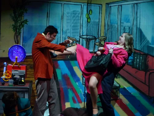 During his trek, Pezzo braved the elements and encountered unusual people, such as an unemployed twirling circus ballerina (Clara Hevia), man on stilts (Marshall Joun), and juggler (Michael Saracco), searching for work. Their circus was disbanded because a lion ate their clown, and everyone knows you can’t have a circus without a clown. Prophetically, Pezzo told them they’d need a barrel of monkeys to jumpstart a new circus. Pezzo wandered into a town of suspicious, dour, unhappy villagers, who shun strangers, because of a continuous rash of unsolved burglaries in their midst. Only one girl, Alina (Caraline Shaheen) and her mother (Megan McMahon), would speak to Pezzo, who gratefully gave Alina a red cap for her kindness.